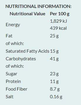 cacaopoeder* (4,6%), sinaasappelvlokken*, cacaonibs* (4,6%), chiazaad*, chili*