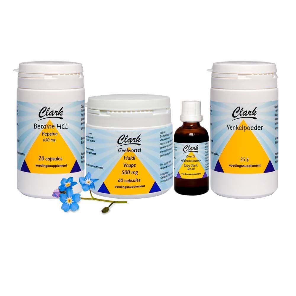 Deze kuur bevat het volgende: 20 vcaps. Betaïne HCL, 60 vcaps. Geelwortel, 25 g Venkelpoeder, 50 ml Walnoottinctuur, Gebruiksaanwijzing