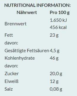 Ingrediënten: Havervlokken*, gierstvlokken*, palmsuiker*, kokossnippers* (8,6%), zonnebloempitten*, haverzemelen*, pompoenpitten*, zonnebloemolie*, agavesiroop*, HAZELNOTEN* (3,2%), CASHEWNOTEN* (3,2%), dadels*, abrikozen*, AMANDELEN* (2,4%), hennepzaad*, pijnboompitten* (1,8%), PISTACHENOTEN* (1,8%), Ceylon kaneel*, cacaopoeder*, kardemom*, koriander*, kruidnagel*, nootmuskaat*, chili*