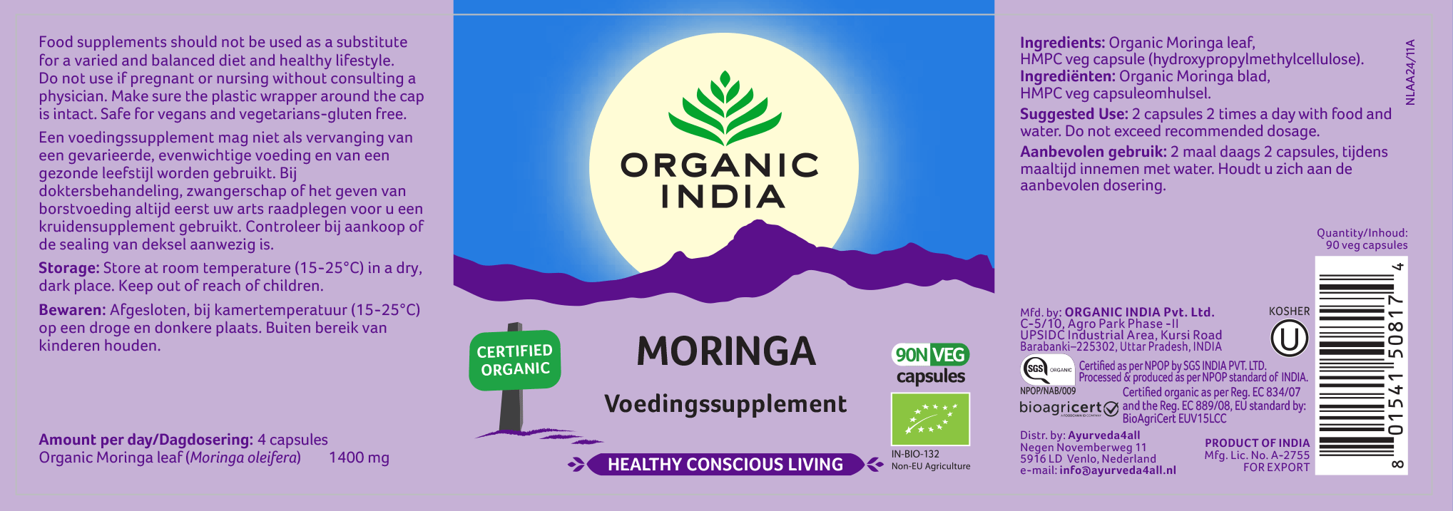 De Organic India Moringa wordt biologisch geteeld op alle boerderijen van Organic India, waar het gebruikt wordt om water te zuiveren, om de bodem te verrijken en de planten te beschermen tegen ongedierte.