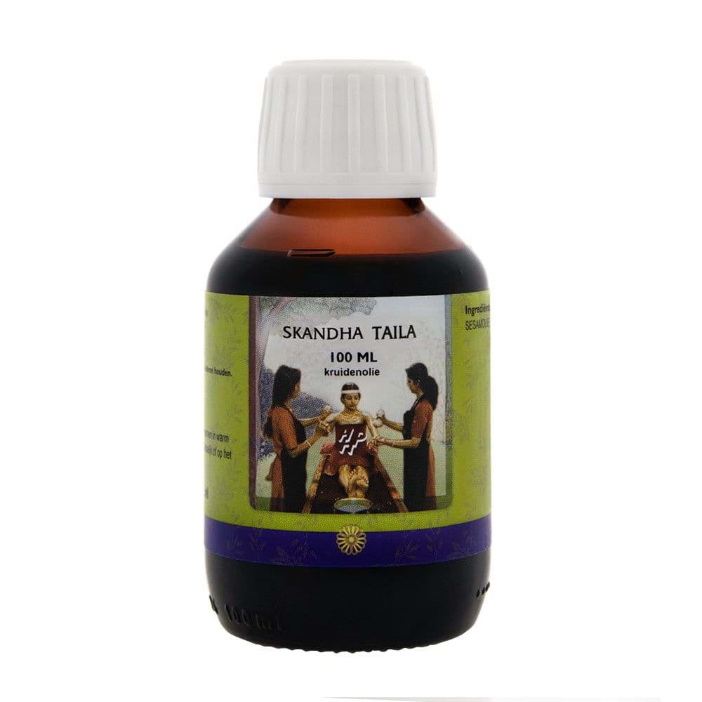 Skandha Taila kan worden gebruikt tijdens een Ayurvedische massage (abhyanga) met continue of herhaalde druk op de schouders, bovenrug en nek. 'Skandha' is het Sanskrit woord voor 'schouders'. Het recept van deze kruidenolie komt oorspronkelijk uit Kerala (ZuidIndia) en bestaat uit rijpe kokosmelk, citroensap, kurkuma (Haridra, Hardi) en delen van de salboom (Ashvakarnika dhoop).De verkoelende olie zorgt voor de bescherming van gezonde weefsels in het gebied van onze bovenste ledematen. Skandha Taila kan verlichting bieden bij gevoelige spieren, vermoeide spieren, stijve spieren of vastzittende spieren. Daarnaast kan de Ayurvedische olie worden gebruikt om flexibele gewrichten te behouden en soepele beweging te bevorderen.