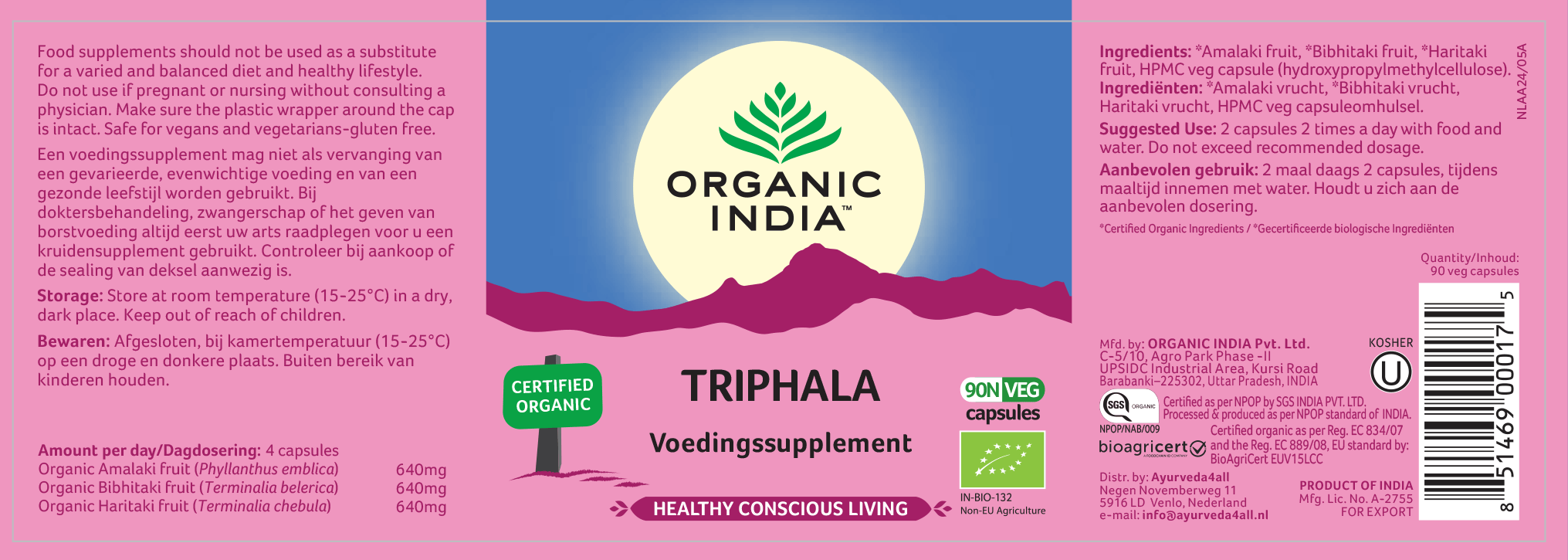 Triphala is een beproefde formule die het maagdarmkanaal reinigt en ondersteunt de spijsvertering, verbetert de eliminatie en assimilatie van voedingsstoffen. Triphala helpt bij het zuiveren van vetophopingen en gifstoffen uit de darmen en helpt het metabolisme te reguleren. Het is rijk aan vitamine C en antioxidanten en ondersteunt het gezichtsvermogen.