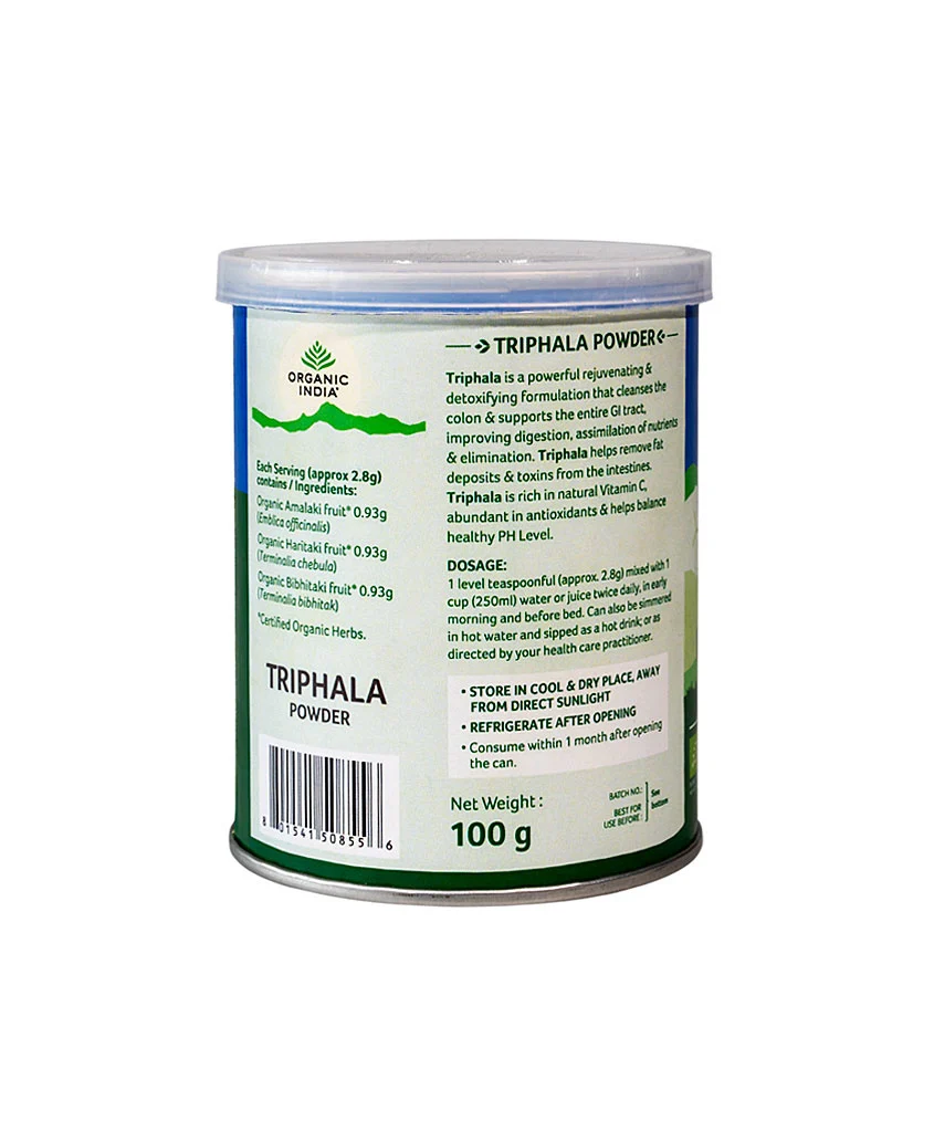 Organic India Triphala is te verkrijgen als poeder in 100g pot of als capsules.