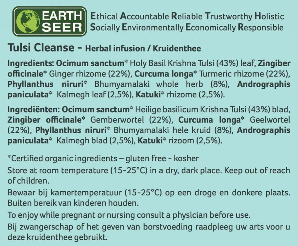 Deze heilzame Tulsi Cleanse thee bevat behalve Krishna Tulsi, bittere kruiden (bitter is goed voor lever) als geelwortel, gember, Bhumy amalaki (Phyllanthus), Katuki and Kalmegh (Andrographis). Deze melange aan kruiden, bekend in Ayurveda als krachtige ontgifters, ondersteunen lever en nieren in het zuiveringsproces van het lichaam.