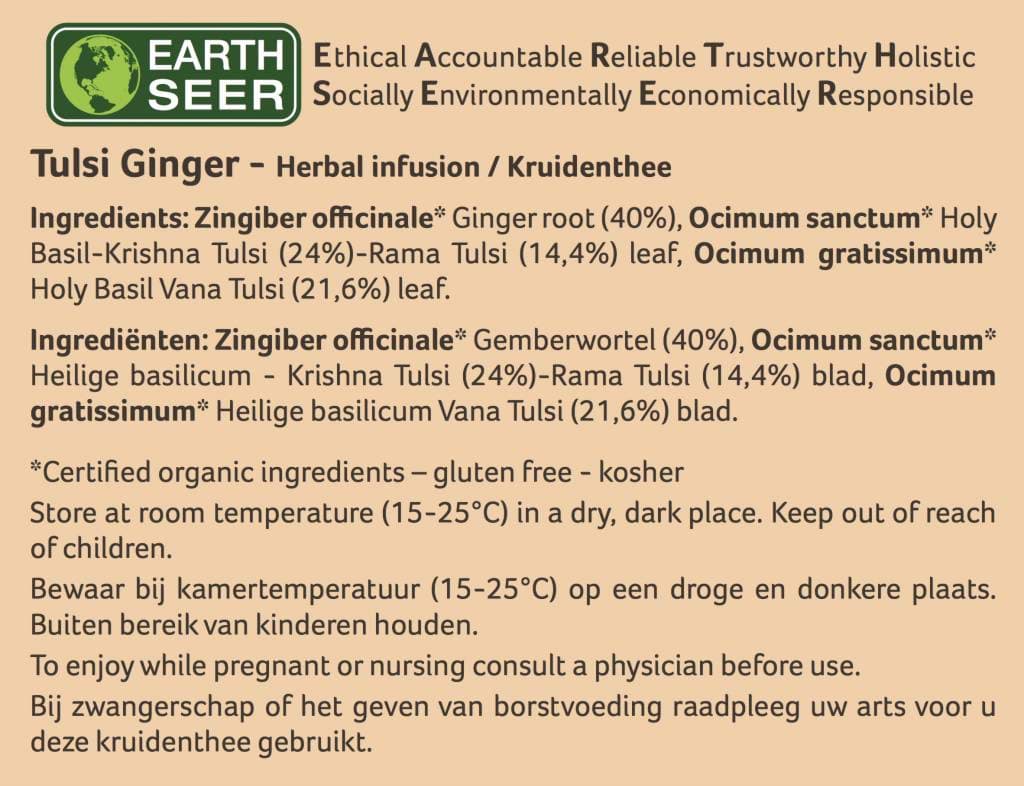 Tulsi Ginger is goed voor het zuur-base evenwicht in de maag, bevordert de circulatie, verzachtend bij verkoudheid. Gember kan veel vormen van misselijkheid verhelpen.
