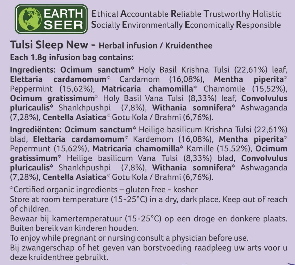 De krachtige Krishna en Vana Tulsi, gecombineerd met Brahmi, Ashwagandha en Shankpushpi zijn kruiden die kunnen helpen bij stress. Kamille, kardemom en pepermunt zijn eraan toegevoegd en zorgen voor een heerlijke melange! Deze heilzame kruiden ondersteunen in de energie nodig voor een gezonde slaap.